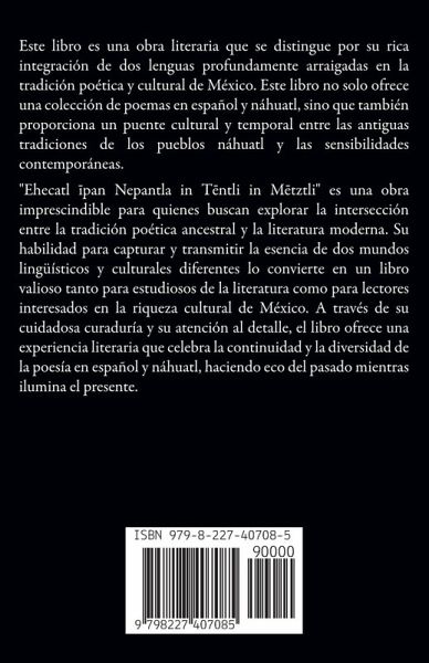 Este libro es una obra literaria que se distingue por su rica integración de dos lenguas profundamente arraigadas en la tradición poética y cultural de México. Este libro no solo ofrece una colección de poemas en español y náhuatl, sino que también proporciona un puente cultural y temporal entre las antiguas tradiciones de los pueblos náhuatl y las sensibilidades contemporáneas. "Ehecatl ¿pan Nepantla in T¿ntli in M¿tztli" es una obra imprescindible para quienes buscan explorar la intersección entre la tradición poética ancestral y la literatura moderna. Su habilidad para capturar y transmitir la esencia de dos mundos lingüísticos y culturales diferentes lo convierte en un libro valioso tanto para estudiosos de la literatura como para lectores interesados en la riqueza cultural de México. A través de su cuidadosa curaduría y su atención al detalle, el libro ofrece una experiencia literaria que celebra la continuidad y la diversidad de la poesía en español y náhuatl, haciendo eco del pasado mientras ilumina el presente.