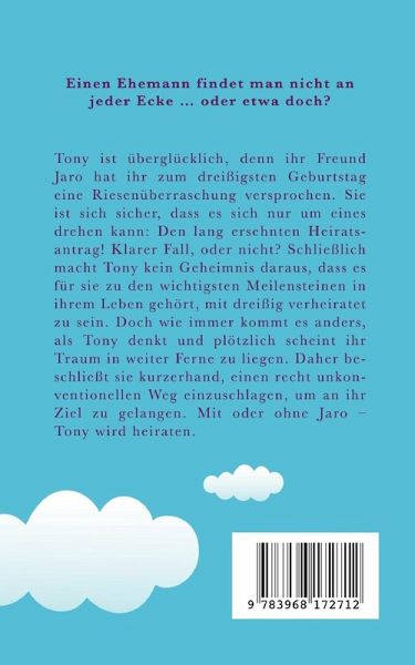 Tony ist überglücklich, denn ihr Freund Jaro hat ihr zum dreißigsten Geburtstag eine Riesenüberraschung versprochen. Sie ist sich sicher, dass es sich nur um eines drehen kann: Den lang ersehnten Heiratsantrag! Klarer Fall, oder nicht? Schließlich macht Tony kein Geheimnis daraus, dass es für sie zu den wichtigsten Meilensteinen in ihrem Leben gehört, mit dreißig verheiratet zu sein. Doch wie immer kommt es anders, als Tony denkt und plötzlich scheint ihr Traum in weiter Ferne zu liegen. Daher beschließt sie kurzerhand, einen recht unkonventionellen Weg einzuschlagen, um an ihr Ziel zu gelangen. Mit oder ohne Jaro - Tony wird heiraten.