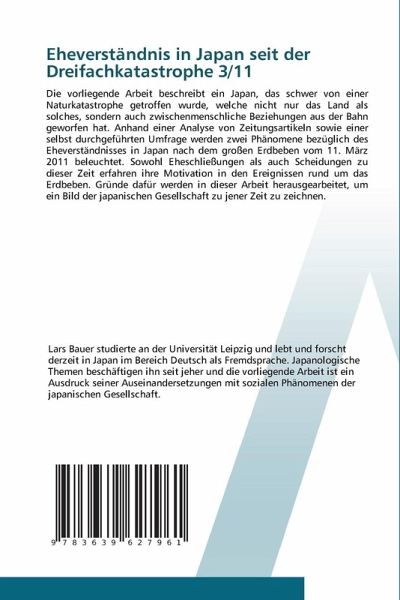 Die vorliegende Arbeit beschreibt ein Japan, das schwer von einer Naturkatastrophe getroffen wurde, welche nicht nur das Land als solches, sondern auch zwischenmenschliche Beziehungen aus der Bahn geworfen hat. Anhand einer Analyse von Zeitungsartikeln sowie einer selbst durchgeführten Umfrage werden zwei Phänomene bezüglich des Eheverständnisses in Japan nach dem großen Erdbeben vom 11. März 2011 beleuchtet. Sowohl Eheschließungen als auch Scheidungen zu dieser Zeit erfahren ihre Motivation in den Ereignissen rund um das Erdbeben. Gründe dafür werden in dieser Arbeit herausgearbeitet, um ein Bild der japanischen Gesellschaft zu jener Zeit zu zeichnen.