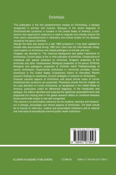 This book is a direct result of a symposium held in December 1988, in Washington, DC, honoring Professor Emeritus Miodrag Ristic for his contributions to rickettsial disease research, in general, and, to ehrlichiosis, in particular. He and his colleagues in the United States Army Medical Research Unit brought to the world's attention an epidemic of ehrlichiosis, that occurred in German shepherd dogs during the Vietnam War. The group was able to culture the microorganism Ehrlichia canis and to fulfill Koch's postulates. They eventually developed an indirect immunofluorescent antibody (IFA) test which has been adopted internationally. The same group joined a national effort to decipher another mysterious disease known as Potomac horse fever (PHF). They used the same technology developed by Nyindo in Dr. Ristic's laboratory to isolate, characterize, and again develop a similar IFA test for PHF. Today PHF has been diagnosed, at least serologically, practically across the entire United States, in some provinces of Canada, and reports are beginning to trickle in of its occurrence in European countries. Thus, the etiologic agent of PHF, now named after Professor Ristic, Ehrlichia risticii, historically places this scientist side by side with the other 2 "R's", i. e. , Ricketts and da Rochalima. Ehrlichiosis is not limited to domestic animals. Sennetsu rickettsiosis, long known by Japanese scientists as an imitator of "infectious mononucleosis," was subsequently shown to be caused by an ehrlichial agent, through collaborative efforts among the United States Army, the University of Illinois, and Dr.