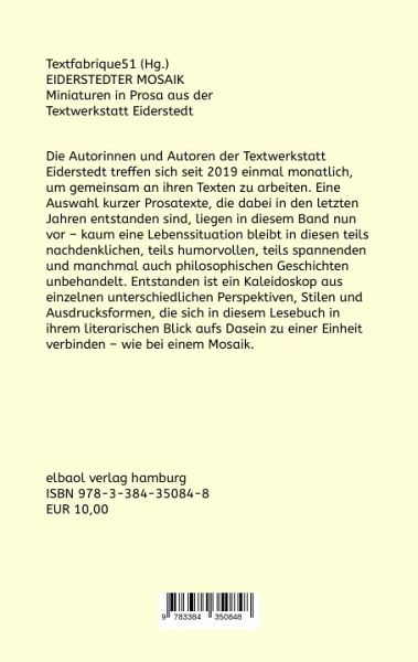 Die Autorinnen und Autoren der Textwerkstatt Eiderstedt treffen sich seit 2019 einmal monatlich, um gemeinsam an ihren Texten zu arbeiten, die sie zu einem zuvor vereinbarten Motto verfasst haben. Eine Auswahl kurzer Prosatexte, die dabei in den letzten Jahren entstanden sind, liegen in diesem Band nun vor - kaum eine Lebenssituation bleibt in diesen teils nachdenklichen, teils humorvollen, teils spannenden und manchmal auch philosophischen Geschichten unbehandelt. Sie sind zu den unterschiedlichsten Stichworten entstanden - es finden sich unter anderem Beiträge zu "Satansbraten", "Marode", "Umzug", "Würde", "Gespräch mit dem Kleiderschrank", "Motorsäge", "Alle auf einmal", "Künstlerpech", "Tier(e) im Haus"... Das Literatur- und Kulturnetzwerk Textfabrique51 - mit einiger Erfahrung als Herausgeber von Anthologien - bringt mit Freude nun auch diese Sammlung unterhaltsamer und lebendiger Texte heraus, ein Kaleidoskop aus einzelnen unterschiedlichen Perspektiven, Stilen und Ausdrucksformen, die sich in diesem Lesebuch in ihrem literarischen Blick aufs Dasein zu einer Einheit verbinden - wie bei einem Mosaik.
