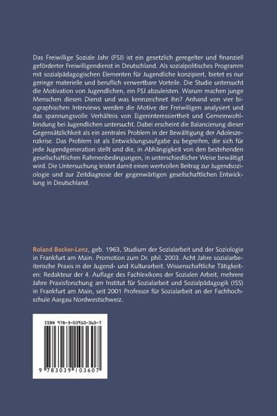 Das Freiwillige Soziale Jahr (FSJ) ist ein gesetzlich geregelter und finanziell geförderter Freiwilligendienst in Deutschland. Als sozialpolitisches Programm mit sozialpädagogischen Elementen für Jugendliche konzipiert, bietet es nur geringe materielle und beruflich verwertbare Vorteile. Die Studie untersucht die Motivation von Jugendlichen, ein FSJ abzuleisten. Warum machen junge Menschen diesen Dienst und was kennzeichnet ihn? Anhand von vier biographischen Interviews werden die Motive der Freiwilligen analysiert und das spannungsvolle Verhältnis von Eigeninteressiertheit und Gemeinwohlbindung bei Jugendlichen untersucht. Dabei erscheint die Balancierung dieser Gegensätzlichkeit als ein zentrales Problem in der Bewältigung der Adoleszenzkrise. Das Problem ist als Entwicklungsaufgabe zu begreifen, die sich für jede Jugendgeneration stellt und die, in Abhängigkeit von den bestehenden gesellschaftlichen Rahmenbedingungen, in unterschiedlicher Weise bewältigt wird. Die Untersuchungleistet damit einen wertvollen Beitrag zur Jugendsoziologie und zur Zeitdiagnose der gegenwärtigen gesellschaftlichen Entwicklung in Deutschland.