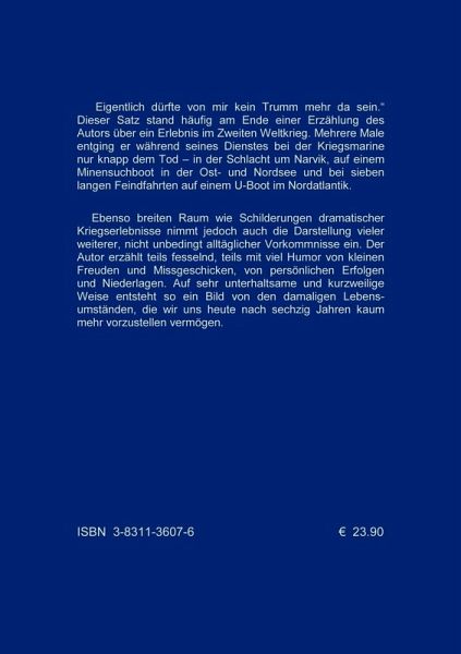 U-Boot näher und versteht es mit seiner klaren, bodenständigen Sprache, nicht nur die Grausamkeiten…mehrFazit des Rezensenten: Ein Buch mit den Erinnerungen eines U-Bootfahrers im 2. Weltkrieg, das sich in wohltuender Weise von vielen anderen solcher Veröffentlichungen unterscheidet. Es bringt uns im Wesentlichen aus der Sicht eines Mannschaftsdienstgrades das Leben, Überleben und Arbeiten auf einem U-Boot näher und versteht es mit seiner klaren, bodenständigen Sprache, nicht nur die Grausamkeiten des Krieges auf See eindringlich näher zu bringen, sondern vor allem den einzigartigen Zusammenhalt einer U-Bootbesatzung herauszustellen. Damit ein sehr lesenswertes Buch, das viel zum Verständnis von U-Bootfahrern beiträgt.