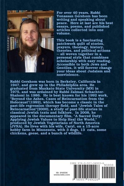 Rabbi Yonassan Gershom, vegetarian and lifelong pacifist, shares his best anti-war articles, thoughts, poems and memories from 40 years of peace activism. Includes his nonviolent Hanukkah service, "Eight Candles of Consciousness"; his anti-Kahane protest actions in the 1980s; essays on ecology and Judaism; why he supports gay rights; how he became a vegetarian; thoughts, essays, stories, prayers, anecdotes and quotes on peace. A fascinating retrospective, woven together in a personal style that combines good scholarship with easy reading. Accessible to both Jews and Gentiles, this anthology will forever change your ideas about Judaism and nonviolence.