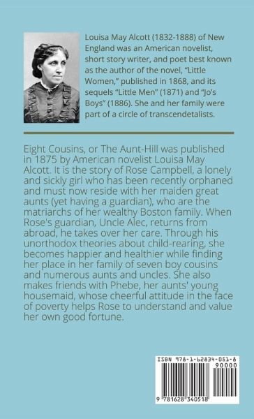 Eight Cousins, or The Aunt-Hill was published in 1875 by American novelist Louisa May Alcott. It is the story of Rose Campbell, a lonely and sickly girl who has been recently orphaned and must now reside with her maiden great aunts (yet having a guardian), who are the matriarchs of her wealthy Boston family. When Rose's guardian, Uncle Alec, returns from abroad, he takes over her care. Through his unorthodox theories about child-rearing, she becomes happier and healthier while finding her place in her family of seven boy cousins and numerous aunts and uncles. She also makes friends with Phebe, her aunts' young housemaid, whose cheerful attitude in the face of poverty helps Rose to understand and value her own good fortune.