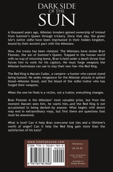An ancient pact was once broken by the theft of Summer's prince. Now, the Red King has found him. To live, to love, they seek the dark side of the sun... A thousand years ago, Milesian invaders gained ownership of Ireland from Summer's Queen through trickery. Since that day, the green isle's native sidhe have been imprisoned in their hidden kingdom, bound by their ancient pact with the Milesians. Now, the treaty has been violated. The Milesians have stolen Bran Fionnan, the son of Summer's queen. Trapped in the human world with no way of returning home, Bran is held under a death threat that forces him to work for his captors. He must forge weapons the Milesian huntresses can use to slay their new foe-the Red King. The Red King is Macsen Cadoc, a vampire-a hunter who cannot stand being hunted. He seeks vengeance for the Milesian attacks in spilled blood-Milesian blood, and the blood of the sidhe traitor who has forged their weapons. When the one he finds is a victim, not a traitor, everything changes. Bran Fionnan is the Milesians' most valuable prize, but from the moment Macsen sees him, he wants him...and the Red King is not accustomed to being denied-by anyone. What begins with desire may end in extraordinary ways, but first there are questions that must be answered. What is love? Can it help Bran overcome lost ties and a lifetime's worth of anger? Can it help the Red King gain more than the satisfaction of his lusts?