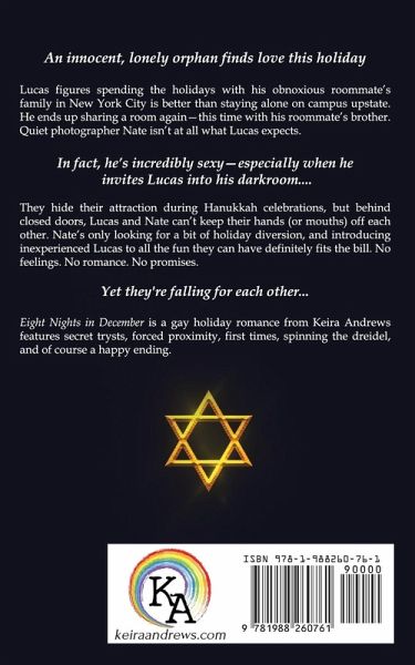 An innocent, lonely orphan finds love this holiday Lucas figures spending the holidays with his obnoxious roommate's family in New York City is better than staying alone on campus upstate. He ends up sharing a room again-this time with his roommate's brother. Quiet photographer Nate isn't at all what Lucas expects. In fact, he's incredibly sexy-especially when he invites Lucas into his darkroom... They hide their attraction during Hanukkah celebrations, but behind closed doors, Lucas and Nate can't keep their hands (or mouths) off each other. Nate's only looking for a bit of holiday diversion, and introducing inexperienced Lucas to all the fun they can have definitely fits the bill. No feelings. No romance. No promises. Yet they're falling for each other... Eight Nights in December is a gay holiday romance from Keira Andrews features secret trysts, forced proximity, first times, spinning the dreidel, and of course a happy ending.
