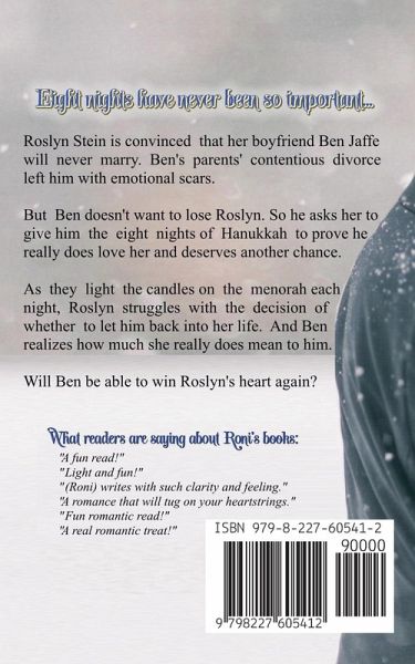 Roslyn Stein is convinced that her boyfriend Ben Jaffe will never marry. Ben's parents' contentious divorce left him with emotional scars. But Ben doesn't want to lose Roslyn. So he asks her to give him the eight nights of Hanukkah, to prove he really does love her and deserves another chance. As they light the candles on the menorah each night, Roslyn struggles with the decision of whether to let him back into her life. And Ben realizes how much she really does mean to him. Will Ben be able to win Roslyn's heart again?