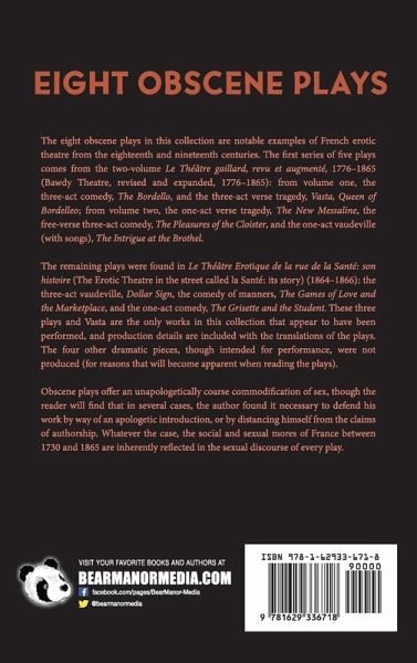 The eight obscene plays in this collection are notable examples of French erotic theatre from the eighteenth and nineteenth centuries. The first series of five plays comes from the two-volume Le Théâtre gaillard, revu et augmenté, 1776-1865 (Bawdy Theatre, revised and expanded, 1776-1865): from volume one, the three-act comedy, The Bordello, and the three-act verse tragedy, Vasta, Queen of Bordelleo; from volume two, the one-act verse tragedy, The New Messaline, the free-verse three-act comedy, The Pleasures of the Cloister, and the one-act vaudeville (with songs), The Intrigue at the Brothel. The remaining plays were found in Le Théâtre Erotique de la rue de la Santé: son histoire (The Erotic Theatre in the street called la Santé: its story) (1864-1866): the three-act vaudeville, Dollar Sign, the comedy of manners, The Games of Love and the Marketplace, and the one-act comedy, The Grisette and the Student. These three plays and Vasta are the only works in this collection that appear to have been performed, and production details are included with the translations of the plays. The four other dramatic pieces, though intended for performance, were not produced (for reasons that will become apparent when reading the plays). Obscene plays offer an unapologetically coarse commodification of sex, though the reader will find that in several cases, the author found it necessary to defend his work by way of an apologetic introduction, or by distancing himself from the claims of authorship. Whatever the case, the social and sexual mores of France between 1730 and 1865 are inherently reflected in the sexual discourse of every play.