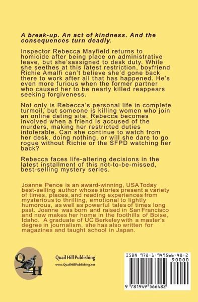 A break-up. An act of kindness. And the consequences turn deadly. Inspector Rebecca Mayfield returns to homicide after being place on administrative leave, but she'sassigned to desk duty. While she seethes at this latest restriction, boyfriend Richie Amalfi can't believe she'd gone back there to work after all that has happened. He's even more furious when the former partner who caused her to nearly be killed reappears seeking forgiveness. Not only is Rebecca's personal life in complete turmoil, but someone is killing women who join an online dating site. Rebecca becomes involved when a friend is accused of the murders, making her restricted duties intolerable. Can she continue to watch from her desk, doing nothing, or will she dare to go rogue without Richie or the SFPD watching her back? Rebecca faces life-altering decisions in the latest installment of this not-to-be-missed, best-selling mystery series.