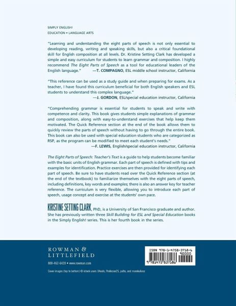 Simply English - 8 Parts of Speech is a guide to help students become familiar with the basic units of grammar, and to help teachers teach it in a constructive way. Each part of speech is defined with tips and examples for identification. Practice exercises are then provided for identifying each part of speech. Be sure to have students read over the Quick Reference (at the end of the textbook) to familiarize themselves with the eight parts of speech. It includes definitions, key words and examples. This reference can be used as a study guide and when preparing for exams. The curriculum is very flexible allowing you to introduce each part of speech, usage concept and exercises at the students' own pace. Of course this will depend on the level of their previous exposure to English grammar. The concepts taught here are more likely to become entrenched if the ideas are incorporated into the students' other writing assignments.