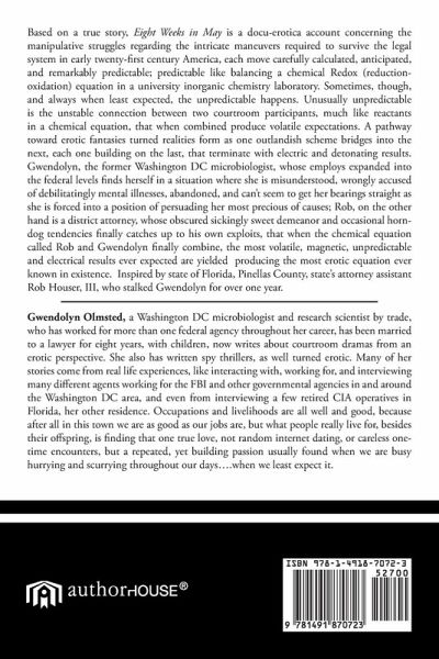 Eight Weeks in May is a fictional account concerning the manipulative struggles regarding the intricate maneuvers required to survive the legal system in twenty-first century America, each move carefully calculated, anticipated, and remarkably predictable; predictable like balancing a chemical Redox (reduction-oxidation) equation in a university inorganic chemistry laboratory. Sometimes, though, and always when least expected, the unpredictable happens. Unusually unpredictable is the unstable connection of two courtroom participants, or dare they be referred to as reactants, that when combined produce volatile expectations. A pathway toward erotic fantasies turned realities form as one outlandish scheme bridges into the next, each one building on the last, that terminate with electric and detonating results. Gwendolyn, the former Washington DC microbiologist, whose employs expanded into the federal levels finds herself in a situation where she is misunderstood, wrongly accused of debilitatingly mental illnesses, abandoned, and can't seem to get her bearings straight as she is forced into a position of persuading her most precious of causes; Rob, on the other hand is a district attorney, whose obscured sickingly sweet demeanor and occasional horn-dog tendencies finally catches up to his own exploits, that when the chemical equation called Rob and Gwendolyn finally combine, the most volatile, unstable, unpredictable and electrical results ever expected are yielded and extracted as a viable product of the most erotic equation ever known in existence.