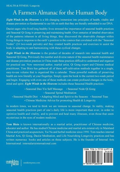 Eight Winds in the Heavens Seasonal Health Secrets and Qi Gong Exercises from Daoist Sages that Prevent Disease and Promote Optimal Health & Vitality Tom Bisio's newest book, Eight Winds in the Heavens, is a life-changing Immersion into principles of health, vitality and disease prevention so fundamental to our life on earth that they are literally embedded in our DNA. This book is literally a "Farmers Almanac" for the Human Body. Daoist sages who lived long, healthy lives stressed the importance of seasonal health practices and Seasonal Qi Gong in preserving and maintaining health. Over centuries of detailed observation of the patterns inherent in all living things, they discovered observable changes within living things in response to the earth's position in the cosmos that correlated with the "Seasonal Nodes" (24 two-week periods), and they created health practices and exercises to assist the body in adapting to and harmonizing with these cyclical changes. Eight Winds in the Heavens is the product of decades of research into seasonal health and Seasonal Qi Gong. Previously the number and diverse nature of the seasonal health maintenance and disease prevention practices in China made these practices difficult to understand and organize for practical use. Now renowned author, martial artist, Qi Gong expert and Chinese medical practitioner, Tom Bisio has gathered all of these self-cultivation methods together in a single, easy-to-use volume that is organized like a calendar. These powerful methods of preserving health are now literally at your fingertips. Simply open the book to the current two-week period and begin. Engaging with even one of these methods can create profound changes in the body, mind and spirit. Eight Winds in the Heavens includes these Seasonal Health practices: - Season Dao Yin Self Massage - Seasonal Node Qi Gong - Seasonal Spinal Meditation - Seasonal Health Diet - Adapting Mind and Spirit to the Seasons - Seas