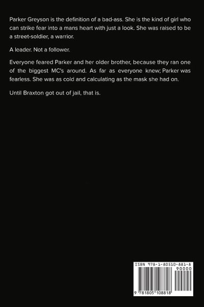 Parker Greyson is the definition of a bad-ass. She is the kind of girl who can strike fear into a mans heart with just a look. She was raised to be a street-soldier, a warrior. A leader. Not a follower. Everyone feared Parker and her older brother, because they ran one of the biggest MC's around. As far as everyone knew; Parker was fearless. She was as cold and calculating as the mask she had on. Until Braxton got out of jail, that is.