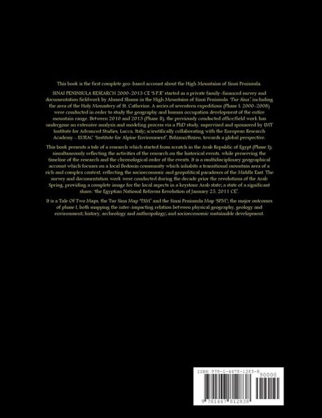 This book is the first complete geo-based account about the High Mountains of Sinai Peninsula. A series of seventeen expeditions (Phase I: 2000-2008) were conducted to study the geography and human occupation development, providing exclusive highly detailed maps. Between 2010 and 2013 (Phase II), the study has undergone an extensive analysis/modeling process, supervised and sponsored by IMT Institute for Advanced Studies; scientifically collaborating with the EURAC - European Research Academy, towards a global perspective. It is a multidisciplinary geographical account which focuses on a local Bedouin community which inhabits a transitional mountain area of a rich and complex context, reflecting the socioeconomic and geopolitical paradoxes of the Middle East, the decade prior the revolutions of the Arab Spring. It presents a complete image for the local aspects in a keystone Arab state; a state of a significant share: 'the Egyptian National Reforms Revolution of January 25, 2011 CE'.