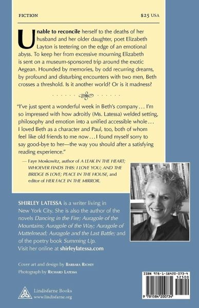 Unable to reconcile herself to the deaths of her husband and her eldest daughter, poet Elizabeth Layton is teetering on the edge of an emotional abyss. To keep her from excessive mourning, her sister and brother pressure Elizabeth into going on a museum sponsored trip to the Aegean. The scenes in the novel are set against the exotic background of Greece, Turkey, Crete, Italy, and the sea.