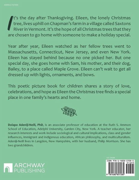 Its the day after Thanksgiving. Eileen, the lonely Christmas tree, lives uphill on Chapmans farm in a village called Saxtons River in Vermont. Its the hope of all Christmas trees that they are chosen to go home with someone to make a holiday special. Year after year, Eileen watched as her fellow trees went to Massachusetts, Connecticut, New Jersey, and even New York. Eileen has stayed behind because no one picked her. But one special day, she goes home with Sam, his mother, and their dog, Bailey, to a place called Maple Grove. Eileen cant wait to get all dressed up with lights, ornaments, and bows. This poetic picture book for children shares a story of love, celebrations, and hope as Eileen the Christmas tree finds a special place in one familys hearts and home.
