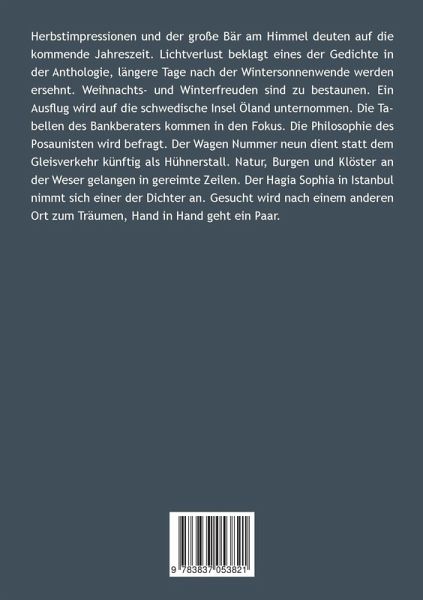 Herbstimpressionen und der große Bär am Himmel deuten auf die kommende Jahreszeit. Lichtverlust beklagt eines der Gedichte in der Anthologie, längere Tage nach der Wintersonnenwende werden ersehnt. Weihnachts- und Winterfreuden sind zu bestaunen. Ein Ausflug wird auf die schwedische Insel Öland unternommen. Die Tabellen des Bankberaters kommen in den Fokus. Die Philosophie des Posaunisten wird befragt. Der Wagen Nummer neun dient statt dem Gleisverkehr künftig als Hühnerstall. Natur, Burgen und Klöster an der Weser gelangen in gereimte Zeilen. Der Hagia Sophia in Istanbul nimmt sich einer der Dichter an. Gesucht wird nach einem anderen Ort zum Träumen, Hand in Hand geht ein Paar.