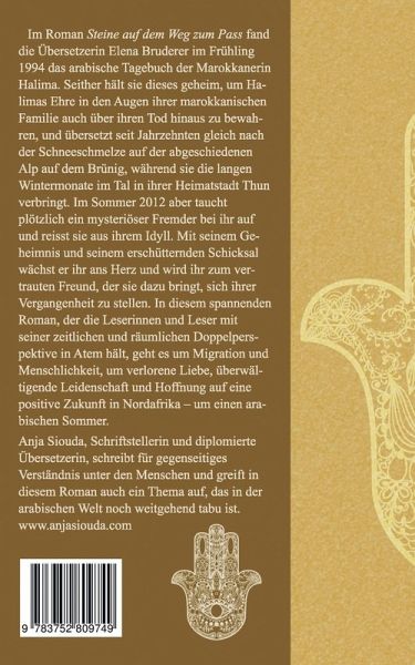 Im Roman "Steine auf dem Weg zum Pass" fand die Übersetzerin Elena Bruderer im Frühling 1994 das arabische Tagebuch der Marokkanerin Halima. Seither hält sie dieses geheim, um Halimas Ehre in den Augen ihrer marokkanischen Familie auch über ihren Tod hinaus zu bewahren, und übersetzt seit Jahrzehnten gleich nach der Schneeschmelze auf der abgeschiedenen Alp auf dem Brünig, während sie die langen Wintermonate im Tal in ihrer Heimatstadt Thun verbringt. Im Sommer 2012 aber taucht plötzlich ein mysteriöser Fremder bei ihr auf und reisst sie aus ihrem Idyll. Mit seinem Geheimnis und seinem erschütternden Schicksal wächst er ihr ans Herz und wird ihr zum vertrauten Freund, der sie dazu bringt, sich ihrer Vergangenheit zu stellen. In diesem spannenden Roman, der die Leserinnen und Leser mit seiner zeitlichen und räumlichen Doppelperspektive in Atem hält, geht es um Migration und Menschlichkeit, um verlorene Liebe, überwältigende Leidenschaft und Hoffnung auf eine positive Zukunft in Nordafrika - um einen arabischen Sommer.Anja Siouda, Schriftstellerin und diplomierte Übersetzerin, schreibt für gegenseitiges Verständnis unter den Menschen und greift in diesem Roman auch ein Thema auf, das in der arabischen Welt noch weitgehend tabu ist.www.anjasiouda.com