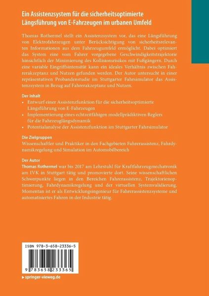 Thomas Rothermel stellt ein Assistenzsystem vor, das eine Längsführung von Elektrofahrzeugen unter Berücksichtigung von sicherheitsrelevanten Informationen aus dem Fahrzeugumfeld ermöglicht. Dabei optimiert das System eine vom Fahrer vorgegebene Geschwindigkeitstrajektorie hinsichtlich der Minimierung des Kollisionsrisikos mit Fußgängern. Durch eine variable Eingriffsintensität kann ein ideales Verhältnis zwischen Fahrerakzeptanz und Nutzen gefunden werden. Der Autor untersucht in einer repräsentativen Probandenstudie im Stuttgarter Fahrsimulator das Assistenzsystem in Bezug auf Fahrerakzeptanz und Nutzen.