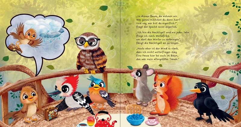 Sechs Tiere wohnen im alten Baum. Als eines Tages eine kleine Nachtigall auf ihrem Balkon landet, sorgt diese für ganz schönen Wirbel und die Tiere im Baum lernen, was Gastfreundschaft und Mitgefühl bedeutet. Die Nachtigall nickt: "Ich bin wirklich froh, dass ihr das sagt, habe mich die halbe Nacht gefragt, ob ihr es noch erkennt oder nicht: Sich zu helfen, das ist Pflicht!" Der Dachs beobachtet das Geschehen. Er hat nun mit eigenen Augen gesehen, dass sich Lernen und Verzeihen sehr gut aneinanderreihen.