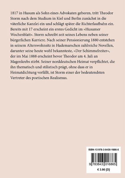 1817 in Husum als Sohn eines Advokaten geboren, tritt Theodor Storm nach dem Studium in Kiel und Berlin zunächst in die väterliche Kanzlei ein und schlägt später die Richterlaufbahn ein. Bereits mit 17 erscheint ein erstes Gedicht im "Husumer Wochenblatt". Storm schreibt zeit seines Lebens neben seiner bürgerlichen Karriere. Nach seiner Pensionierung 1880 entstehen in seinem Alterswohnsitz in Hademarschen zahlreiche Novellen, darunter seine heute wohl bekannteste, "Der Schimmelreiter", der im Mai 1888 erscheint bevor Theodor am 4. Juli an Magenkrebs stirbt. Seiner norddeutschen Heimat verpflichtet, die ihn thematisch und stilistisch prägt, ohne dass er in Heimatdichtung verfällt, ist Storm einer der bedeutendsten Vertreter des poetischen Realismus.