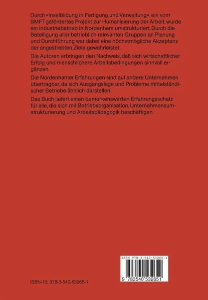 Durch "Inselbildung in Fertigung und Verwaltung", ein vom BMFT gefördertes Projekt zur Humanisierung der Arbeit, wurde ein Industriebetrieb in Nordenham umstrukturiert. Durch die Beteiligung aller betrieblich relevanten Gruppen an Planung und Durchführung war dabei eine höchstmögliche Akzeptanz der angestrebten Ziele gewährleistet. Die Autoren erbringen den Nachweis, daß sich wirtschaftlicher Erfolg und menschlichere Arbeitsbedingungen sinnvoll ergänzen. Die Nordenhamer Erfahrungen sind auf andere Unternehmen übertragbar, da sich Ausgangslage und Probleme mittelständischer Betriebe ähnlich darstellen. Das Buch liefert einen bemerkenswerten Erfahrungsschatz für alle, die sich mit Betriebsorganisation, Unternehmensumstrukturierung und Arbeitspädagogik beschäftigen.