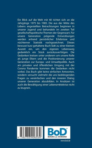 Ein Blick auf die Welt mit 40 richtet sich an die Jahrgänge 1975 bis 1985. Die aus der Mitte des Lebens angestellten Betrachtungen beginnen in unserer Jugend und behandeln im zweiten Teil des Buches gesellschaftspolitische Themen der Gegenwart. Die für unsere Generation prägenden Entwicklungen werden anhand persönlicher Erlebnisse und nüchterner Statistik nachgezeichnet. Dieses bewusst kurz gehaltene Buch lädt zu einer kleinen Auszeit ein, um den eigenen Lebensweg gedanklich ein Stück zurückzuverfolgen. Die Gedanken kreisen unter anderem um unsere Rolle als junge Eltern und die Positionierung unserer Generation zur Europa- und Umweltpolitik. Auch am privaten und öffentlichen Umgang mit der Corona Pandemie kommen die Gedanken nicht vorbei. Das Buch gibt keine einfachen Antworten, versucht vielmehr die uns bedrängenden Fragen zu vereinfachen und den inneren Dialog unserer Generation abzubilden. In Ansätzen ist auch die Bewältigung einer Lebensmittekrise nicht zu leugnen.