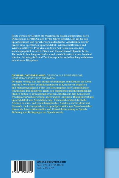 Wolfgang Klein, Leiter des Heidelberger Projektes Pidgindeutsch (HPD), Norbert Dittmar aus dem HPD und Vertreter der Soziolinguistik, Konrad Ehlich und Jochen Rehbein, Begründer der Funktionalen Pragmatik und Verfechter einer Mehrsprachigkeitsperspektive, ziehen in Hinblick auf soziale Varietäten und Spracherwerb ebenso Bilanz wie Hans Barkowski, Wilhelm Grießhaber, Ingelore Oomen-Welke und Ulrich Steinmüller, die sich u.a. der Frage stellen, welche Sprachvermittlung für Deutsch als Zweitsprache angemessen wäre. Einige der Beitragenden stellen auch die biographischen Rahmenbedingungen dar, wie es zu ihrer Befassung mit der Spracherwerbssituation und Sprachlernangeboten für Arbeiterinnen und Arbeitern und deren Kindern kam.