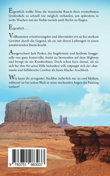 Eigentlich wollte Nina die texanische Ranch ihres verstorbenen Großonkels so schnell wie möglich verkaufen, um spätestens in sechs Wochen mit der Kohle zurück nach Berlin zu fliegen.Eigentlich ...Vollkommen orientierungslos und übermüdet irrt sie bei starkem Gewitter durch die Gegend, als sie mit ihrem Leihwagen in einen umstürzenden Baum kracht.Ausgerechnet Jack Parker, der begehrteste und heißeste Junggeselle von ganz Somerville, findet sie bewusstlos auf dem Highway und bringt sie ins Krankenhaus. Doch schon kurz darauf, als sie sich bei ihm für die Hilfe bedanken will, entpuppt sich der charmante und hilfsbereite Cowboy als fieses Macho-Arschloch.Wie kann ihr arroganter Nachbar äußerlich nur so cool bleiben, während sie bei jedem Blick in seine stechenden Augen die Fassung verliert?