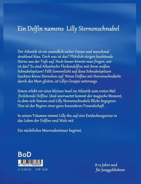 Der Atlantik ist ein unendlich weiter Ozean und manchmal strahlend blau. Doch was ist das? Plötzlich steigen leuchtende Sterne aus der Tiefe auf. Noch besser könnte man fragen, wer ist das? Es sind Atlantische Fleckendelfine mit ihren weißen Schnabelspitzen! Fällt Sonnenlicht auf diese Schnabelspitzen leuchten kleine Sternchen auf. Wenn Delfine mit Sternenschnäbeln durch das Meer gleiten, ist Lillys Gruppe unterwegs.Simon erlebt vor einer kleinen Insel im Atlantik zum ersten Mal freilebende Delfine. Und unerwartet kommt der magische Moment, in dem sich Simons und Lilly Sternenschnabels Blicke begegnen. Dies ist der Beginn einer ganz besonderen Freundschaft. Denn in seinen Träumen nimmt Lilly ihn auf eine Entdeckungsreise in das Leben der Delfine und Wale mit. Ein nächtliches Meeresabenteuer beginnt.