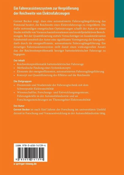Gernot Becker zeigt, dass eine automatisierte Fahrzeuglängsführung das Potenzial besitzt, die Reichweite eines Elektrofahrzeugs zu vergrößern. Die dafür notwendigen energetischen Optimierungen schafft der Autor in seiner Studie mithilfe von Vorausschauinformationen und modellprädiktiven Berechnungen. Bei der Quantifizierung mittels Versuchsträger im kundenrelevanten Fahrbetrieb ermittelt der Autor eine signifikante Verringerung des Energiebedarfs durch die energieeffiziente, automatisierte Fahrzeuglängsführung. Ein derartiges Fahrerassistenzsystem stellt damit einen wirkungsvollen Ansatz dar, der Reichweitenproblematik heutiger batterieelektrischer Fahrzeuge zu begegnen.
