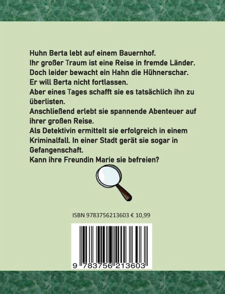 Huhn Berta lebt auf einem Bauernhof. Ihr großer Traum ist eine Reise in fremde Länder. Doch leider bewacht ein Hahn die Hühnerschar. Er will Berta nicht fortlassen. Aber eines Tages schafft sie es tatsächlich ihn zu überlisten.Anschließend erlebt sie spannende Abenteuer auf ihrer großen Reise.Als Detektivin ermittelt sie erfolgreich in einem Kriminalfall. In einer Stadt gerät sie sogar in Gefangenschaft.Kann ihre Freundin Marie sie befreien?