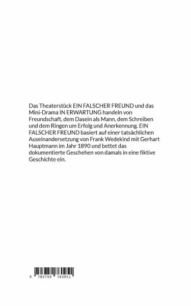 Das Theaterstück EIN FALSCHER FREUND und das Mini-Drama IN ERWARTUNG handeln von Freundschaft, dem Dasein als Mann, dem Schreiben und dem Ringen um Erfolg und Anerkennung. EIN FALSCHER FREUND basiert auf einer tatsächlichen Auseinandersetzung von Frank Wedekind mit Gerhart Hauptmann im Jahr 1890 und bettet das dokumentierte Geschehen von damals in eine fiktive Geschichte ein.