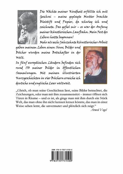 In seiner Autobiografie "Ein Fuchs mit acht Beinen" erzählt der Maler, Zeichner und Schriftsteller Peter Halfar, Jahrgang 1935: "Die Nächte meiner Kindheit erfüllte ich mit Geschrei. Meine geplagte Mutter brachte Bleistift und Papier; da schwieg ich und zeichnete einen Fuchs mit acht Beinen. Das gefiel mir. Es war der Anfang meiner künstlerischen Laufbahn. Mein Fest des Lebens hatte begonnen!" Wie er es in mehr als sechzig Jahrzehnten künstlerischer Arbeit feierte, schildert er in 41 Kurzgeschichten, ergänzt um 60 Bilder und sachlich informierende Zwischentexte. "Ich wollte nichts haben, ich wollte etwas machen", schreibt Halfar, "die Sinnentleertheit des Daseins zu füllen, ist der Impuls, der mich zu überdimensionalen kreativen Phasen motiviert." Der Erfolg: Drei deutsche Kurzgeschichtenbände, ein vierter englischer, erschienen in USA, private Sammlungen seiner Bilder in Europa und USA, öffentliche in fünf europäischen Ländern. - Arwed Vogel, Dozent des freien Literaturprojekts München, über Halfars Kunst: "Gleich, ob man seine Geschichten liest, seine Bilder betrachtet, die Zeichnungen, oder man mit ihm zusammensitzt - immer öffnen sich Türen in Räume - und es ist, als ginge man mit ihm durch ein Stück Welt, das man ohne ihn nicht kennen lernen könnte, das man in einer Weise sehen lernt, die unvermutet und plötzlich sich zeigt."