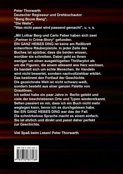 "Ein ganz heißes Ding" ist ein Hauptstadtkrimi. In ihm treffen nicht nur die Kleinen auf die Großen der Politik, hier prallen ebenso die Kompetenzen der Ermittlungen aufeinander, wie auch die Interessen der unscheinbaren Gauner auf die der gewieften Ganoven.Was für die einen die Portokasse ist, bedeutet für die anderen die Altersversorgung, aber letztendlich geht es für alle nur ums eins ... um Geld.Als Grassi und Jens den Kiosk am Breslauer Platz in Berlin-Friedenau knacken ist das für sie Routine. Aber dann eskalieren die Ereignisse und es wird für sie "Ein ganz heißes Ding"
