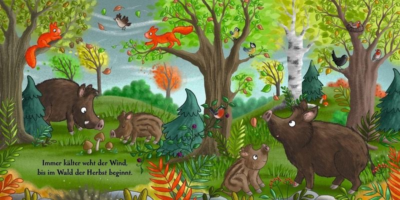 Was machen die Waldtiere, wenn sich das Rad der Jahreszeiten dreht? Jede Jahreszeit wird liebevoll in Szene gesetzt, während die beliebtesten Waldtiere in kurzen, kindgerechten Reimen und verspielten Illustrationen die Natur entdecken. Ob Tierkinder im Frühling, herumtollende Füchse im Sommer, niedliche Eichhörnchen im Herbst oder schlummernde Bären im Winter - hier gibt es viel zu sehen und zu staunen!