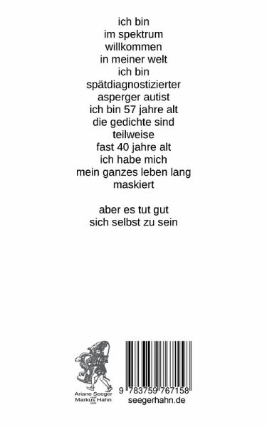 ich bin im spektrum willkommen in meiner welt ich bin spätdiagnostizierter asperger autist ich bin 57 jahre alt die gedichte sind teilweise fast 40 jahre alt ich habe mich mein ganzes leben lang maskiert aber es tut gut sich selbst zu sein