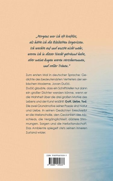 "Morgens war ich oft kraftlos,als hätte ich die Bleiketten losgerissen.Ich wachte auf und wusste nicht mehr,wovon ich in dieser Nacht geträumt habe,aber meine Augen waren verschwommen,und voller Tränen."Zum ersten Mal in deutscher Sprache: Gedichte des bedeutendsten Vertreters der serbischen Moderne, Jovan Ducic. Ducic glaubte, dass ein Schriftsteller nur dann ein großer Dichter werden könne, wenn er die Wahrheit über die drei großen Motive des Lebens und der Kunst erzählt: Gott, Liebe, Tod.Die zwei Grundmotive seiner Poesie sind Natur und Liebe. In seinen Gedichten beschreibt er die Melancholie, den Gedanken des Abschieds, die Vergänglichkeit, düstere Stimmungen, Sorgen und die Herbstlandschaft. Das Ambiente spiegelt stets seinen inneren Zustand wider.