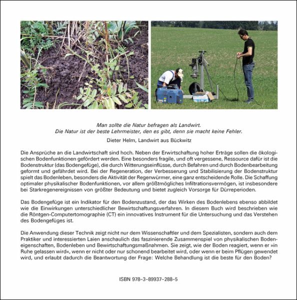 Man sollte die Natur befragen als Landwirt. Die Natur ist der beste Lehrmeister, den es gibt, denn sie macht keine Fehler.Dieter Helm, Landwirt aus BückwitzDie Ansprüche an die Landwirtschaft sind hoch. Neben der Erwirtschaftung hoher Erträge sollen die ökologischen Bodenfunktionen gefördert werden. Eine besonders fragile, und oft vergessene, Ressource dafür ist die Bodenstruktur (das Bodengefüge), die durch Witterungseinflüsse, durch Befahren und durch Bodenbearbeitung gefährdet und geformt wird. Bei der Regeneration, der Verbesserung und Stabilisierung der Bodenstruktur spielt das Bodenleben, besonders die Aktivität der Regenwürmer, eine ganz entscheidende Rolle. Die Schaffung optimaler physikalischer Bodenfunktionen, vor allem größtmögliches Infiltrationsvermögen, ist insbesondere bei Starkregenereignissen von größter Bedeutung und bietet zugleich Vorsorge für Dürreperioden.Das Bodengefüge ist ein Indikator für den Bodenzustand, der das Wirken des Bodenlebens ebenso abbildet wie die Einwirkungen unterschiedlicher Bewirtschaftungsverfahren. In diesem Buch wird beschrieben wie die Röntgen-Computertomographie (CT) ein innovatives Instrument für die Untersuchung und das Verstehen des Bodengefüges ist.Die Anwendung dieser Technik zeigt nicht nur dem Wissenschaftler und dem Spezialisten, sondern auch dem Praktiker und interessierten Laien anschaulich das faszinierende Zusammenspiel von physikalischen Bodeneigenschaften, Bodenleben und Bewirtschaftungsmaßnahmen. Sie zeigt, wie der Boden reagiert, wenn er »in Ruhe gelassen wird«, wenn er nicht oder nur schonend bearbeitet wird, oder wenn er beim Pflügen gewendet wird, und erlaubt dadurch die Beantwortung der Frage: Welche Behandlung ist die beste für den Boden?