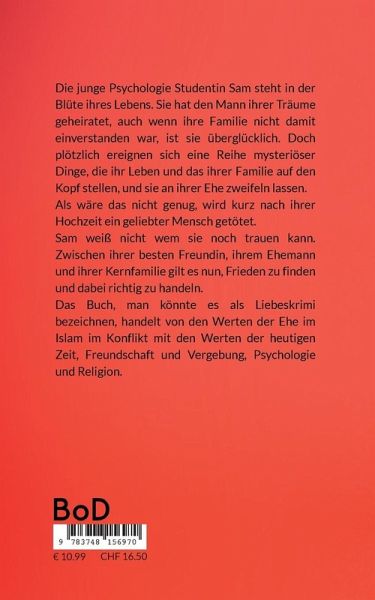 Die junge Psychologie Studentin Sam steht in der Blüte ihres Lebens. Sie hat den Mann ihrer Träume geheiratet, auch wenn ihre Familie nicht damit einverstanden war, ist sie überglücklich. Doch plötzlich ereignen sich eine Reihe mysteriöser Dinge, die ihr Leben und das ihrer Familie auf den Kopf stellen, und sie an ihrer Ehe zweifeln lassen.Als wäre das nicht genug, wird kurz nach ihrer Hochzeit ein geliebter Mensch getötet.Sam weiß nicht wem sie noch trauen kann. Zwischen ihrer besten Freundin, ihrem Ehemann und ihrer Kernfamilie gilt es nun, Frieden zu finden und dabei richtig zu handeln.Das Buch, man könnte es als Liebeskrimi bezeichnen, handelt von den Werten der Ehe im Islam im Konflikt mit den Werten der heutigen Zeit, Freundschaft und Vergebung, Psychologie und Religion.