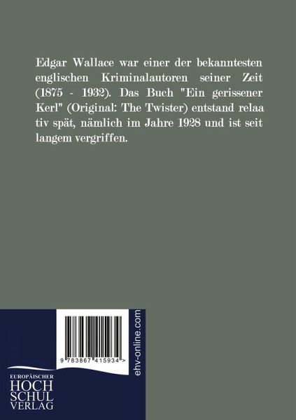 Edgar Wallace war einer der bekanntesten englischen Kriminalautoren seiner Zeit (1875 - 1932). Das Buch "Ein gerissener Kerl" (Original: The Twister) entstand relativ spät, nämlich im Jahre 1928 und ist seit langem vergriffen. Diese vollständig bearbeitete Neuausgabe enthält eine Anhang mit vielen Abbildungen der originalen Schauplätze zum Vertiefen oder gar zum Nachwandern im London der heutigen Zeit.