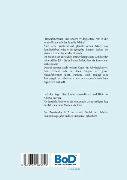 Hasenfußrennen und andere Widrigkeiten. Auf in die zweite Runde mit der Familie Adaire!Nach dem Familienurlaub glaubte Jordan Adaire, ihr Leben wieder in geregelte Bahnen lenken zu können.Leider lag sie damit falsch.Während Stan Adaire immer komplexere Gefühle für seine Affäre Jill entwickelt, wird ihm gleichzeitig bewusst, auch Jill verheimlicht etwas vor ihm.Derweil beschließt Jacob sein Taschengeld aufzubessern - indem er seinen Mitschülern Zigaretten und Bier verkauft. Was sich zuerst lukrativ anhört, bringt ihn letztlich in ziemliche Schwierigkeiten.Außerdem findet Erin ihren ersten Freund, jener ist allerdings ein begeisterter Fan von Hasenfußrennen, was schwerlich ein harmloses Hobby ist, wie sie rasch begreift.Natürlich gehen all jene Probleme nicht spurlos an Jordan vorbei, was am Ende dazu führt, dass sie die Lösung ihrer Probleme lieber am Boden einer Wodkaflasche zu finden versucht...Am Ende steht Halloween an, der vielleicht gruseligste Tag des Jahres. Und dieses Jahr macht der Tag der Toten seinem Ruf alle Ehre!Die Bookisodes 9 -17 der ersten Staffel der Familiensaga!