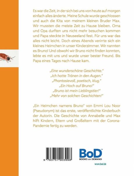 Es war die Zeit, in der sich bei uns von heute auf morgen einfach alles änderte. Meine Schule wurde geschlossen und auch die Kita von meinem kleinen Bruder Max. Wir mussten die meiste Zeit zu Hause bleiben. Oma und Opa durften uns nicht mehr besuchen kommen und Papa steckte in Neuseeland fest. Für uns war das alles nicht leicht. Doch eines Abends verirrte sich ein kleines Heimchen in unser Kinderzimmer. Wir nannten es Bruno! Und obwohl wir Bruno nicht finden konnten, lebte es mit uns und wurde unser bester Freund. Bis Papa eines Tages nach Hause kam.