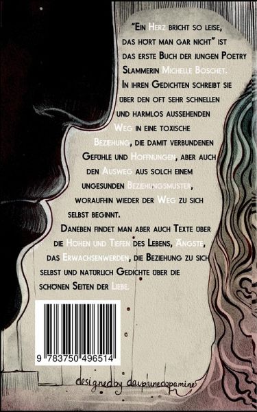 "Ein Herz bricht so leise, das hört man gar nicht" ist das erste Buch der Schleswig-Holstein Poetry Slam Landesmeisterin Michelle Boschet. In ihren Gedichten schreibt sie über den oft sehr schnellen und harmlos aussehenden Weg in eine toxische Beziehung, die damit verbundenen Gefühle und Hoffnungen, aber auch den Ausweg aus solch einem ungesunden Beziehungsmuster, woraufhin wieder der Weg zu sich selbst beginnt.Daneben findet man aber auch Texte über die Höhen und Tiefen des Lebens, Ängste, das Erwachsenwerden, die Beziehung zu sich selbst und natürlich Gedichte über die schönen Seiten der Liebe.
