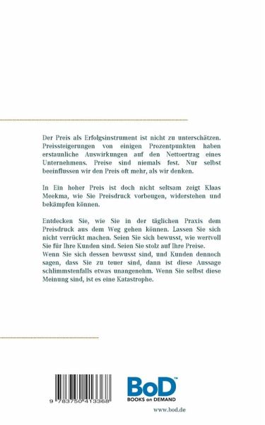 Der Preis als Erfolgsinstrument ist nicht zu unterschätzen. Preissteigerungen von einigen Prozentpunkten haben erstaunliche Auswirkungen auf den Nettoertrag eines Unternehmens. Preise sind niemals fest. Nur selbst beeinflussen wir den Preis oft mehr, als wir denken.In Ein hoher Preis ist doch nicht seltsam zeigt Klaas Meekma, wie Sie Preisdruck vorbeugen, widerstehen und bekämpfen können. Entdecken Sie, wie Sie in der täglichen Praxis dem Preisdruck aus dem Weg gehen können. Lassen Sie sich nicht verrückt machen. Seien Sie sich bewusst, wie wertvoll Sie für Ihre Kunden sind. Seien Sie stolz auf Ihre Preise.Wenn Sie sich dessen bewusst sind, und Kunden dennoch sagen, dass Sie zu teuer sind, dann ist diese Aussage schlimmstenfalls etwas unangenehm. Wenn Sie selbst diese Meinung sind, ist es eine Katastrophe.