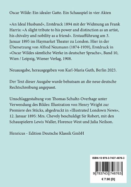 Oscar Wilde: Ein idealer Gatte. Ein Schauspiel in vier Akten»An Ideal Husband«, Erstdruck 1894 mit der Widmung an Frank Harris: »A slight tribute to his power and distinction as an artist, his chivalry and nobility as a friend«. Erstaufführung am 3. Januar 1895 im Haymarket Theater zu London. Hier in der Übersetzung von Alfred Neumann (1874-1939), Erstdruck in »Oscar Wildes sämtliche Werke in deutscher Sprache«, Band 10, Wien / Leipzig, Wiener Verlag, 1908.Neuausgabe, herausgegeben von Karl-Maria Guth, Berlin 2023.Der Text dieser Ausgabe wurde behutsam an die neue deutsche Rechtschreibung angepasst.Umschlagabbildung: Illustration von Henry Wright zur Premiere des Stücks, abgedruckt in »Illustrated Londown News«, 12. Januar 1895: Mrs. Chevely beschuldigt Sir Robert, mit den Schauspielern Lewis Waller, Florence West und Julia NeilsonGesetzt aus der Minion Pro, 11 pt.Die Sammlung Hofenberg erscheint im Verlag Henricus - Edition Deutsche Klassik GmbH, BerlinÜber den Autor:1854 in Dublin als zweites von drei Kindern eines bekannten Augenarztes und einer Schriftstellerin geboren, lässt sich Oscar Fingal O'Flahertie Wills Wilde nach dem Literaturstudium in Dublin und Oxford in London nieder. Der schlagfertig humorvolle Freimaurer entwickelt sich zu einem berühmt berüchtigten Skandalautor, genießt seinen schlechten Ruf als Dandy und pflegt einen extravaganten Auftritt in samtenen Kniebundhosen mit Seidenstrümpfen. Er wird gehässig karikiert und zugleich für seine Bonmots gefeiert. 30-jährig heiratet der inzwischen weltberühmte Dichter die wohlhabende und bildschöne Kinderautorin Constance Mary Loyd, mit der er zwei Söhne haben wird. 1895 zettelt der Vater seines langjährigen Liebhabers Lord Alfred Douglas einen Prozess wegen der damals schwer bestraften Homosexualität gegen ihn an, der ihn für zwei Jahre ins Zuchthaus bringt. Die menschenverachtenden Haftbedingungen in Isolation und Dunkelheit mit harter Zwangsarbeit ruinieren seine Gesundheit. Nach seiner Entlassung lebt er verarmt, vereinsamt und krank in Paris. Am 30. November 1900 stirbt mit Oscar Wilde ein charismatischer Repräsentant der Dekadenz und eine der schillerndsten Figuren des viktorianischen Englands. 1917 schreibt Alfred Kerr über Oscar Wilde »Seine langsame Hinrichtung bleibt der letzte Akt des Mittelalters.«