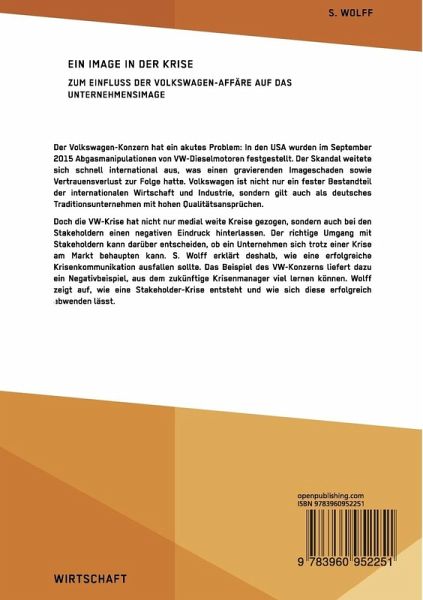 Der Volkswagen-Konzern hat ein akutes Problem: In den USA wurden im September 2015 Abgasmanipulationen von VW-Dieselmotoren festgestellt. Der Skandal weitete sich schnell international aus, was einen gravierenden Imageschaden sowie Vertrauensverlust zur Folge hatte. Volkswagen ist nicht nur ein fester Bestandteil der internationalen Wirtschaft und Industrie, sondern gilt auch als deutsches Traditionsunternehmen mit hohen Qualitätsansprüchen.Doch die VW-Krise hat nicht nur medial weite Kreise gezogen, sondern auch bei den Stakeholdern einen negativen Eindruck hinterlassen. Der richtige Umgang mit Stakeholdern kann darüber entscheiden, ob ein Unternehmen sich trotz einer Krise am Markt behaupten kann. S. Wolff erklärt deshalb, wie eine erfolgreiche Krisenkommunikation ausfallen sollte. Das Beispiel des VW-Konzerns liefert dazu ein Negativbeispiel, aus dem zukünftige Krisenmanager viel lernen können. Wolff zeigt auf, wie eine Stakeholder-Krise entsteht und wie sich diese erfolgreichabwenden lässt.Aus dem Inhalt:- VW-Krise;- Abgasskandal;- Volkswagen;- Stakeholder;- Krisenkommunikation