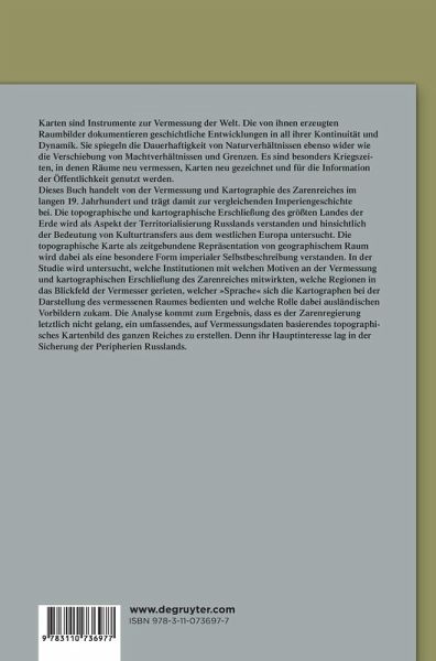 Dieses Buch handelt von der Vermessung und Kartographie des Zarenreiches im langen 19. Jahrhundert und trägt damit zur vergleichenden Imperiengeschichte bei. Die topographische und kartographische Erschließung des größten Landes der Erde wird als Aspekt der Territorialisierung Russlands verstanden und hinsichtlich der Bedeutung von Kulturtransfers aus dem westlichen Europa untersucht. Die topographische Karte als zeitgebundene Repräsentation von geographischem Raum wird dabei als eine besondere Form imperialer Selbstbeschreibung verstanden. In der Studie wird untersucht, welche Institutionen mit welchen Motiven an der Vermessung und kartographischen Erschließung des Zarenreiches mitwirkten, welche Regionen in das Blickfeld der Vermesser gerieten, welcher »Sprache« sich die Kartographen bei der Darstellung des vermessenen Raumes bedienten und welche Rolle dabei ausländischen Vorbildern zukam. Die Analyse kommt zum Ergebnis, dass es der Zarenregierung letztlich nicht gelang, ein umfassendes, auf Vermessungsdaten basierendes topographisches Kartenbild des ganzen Reiches zu erstellen. Denn ihr Hauptinteresse lag in der Sicherung der Peripherien Russlands.