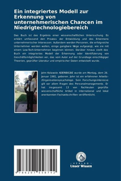 Das Buch ist das Ergebnis einer wissenschaftlichen Untersuchung. Es erklärt umfassend den Prozess der Entwicklung und des Erkennens unternehmerischer Interessen. Außerdem werden Personen, die erfolgreiche Unternehmer werden wollen, einige gangbare Wege aufgezeigt, wie sie mit einem Low-Tech-Unternehmen beginnen können. Darüber hinaus stellt das Buch ein integriertes Modell der Erkennung oder Identifizierung von Geschäftsmöglichkeiten vor, das vom Autor auf der Grundlage einschlägiger Theorien, geprüfter Literatur und empirischer Daten entwickelt wurde.